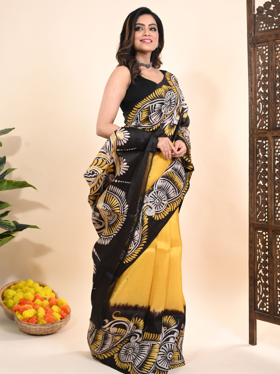 Indulge in the epitome of luxury with our Kataan Silk collection, featuring the finest Bishnupur silk varieties. This premium silk showcases an exceptional drape and natural luster that enhances the depth and vibrancy of our batik prints. Perfect for special occasions and formal gatherings, these pieces embody sophistication and grace. The smooth texture and rich feel of Kataan silk create an unmatched wearing experience, while the artistic batik patterns add cultural depth and visual interest to every ensemble.